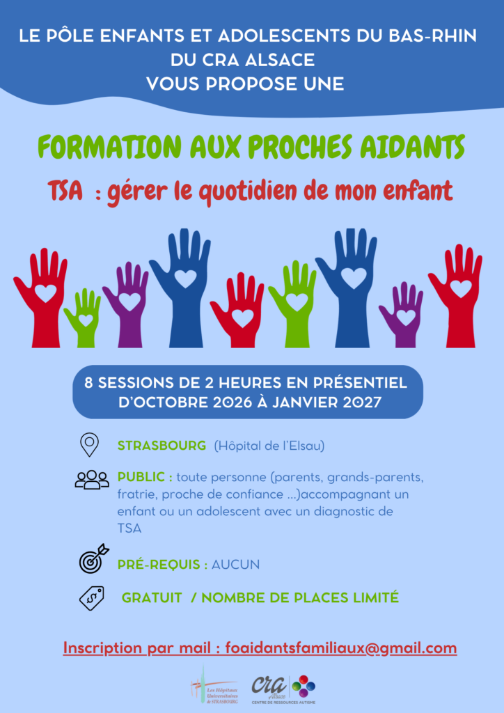 Le pôle enfants et adolescents 67 du CRA Alsace propose une session de formation gratuite pour les proches d’un enfant ou adolescent présentant un Trouble du Spectre de l’Autisme sur le thème “Gérer le quotidien de mon enfant avec TSA de septembre 2026 à janvier 2027.