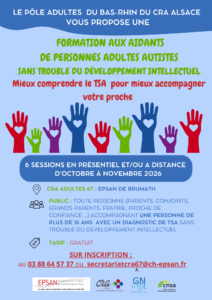 Le pôle Adultes du Bas-Rhin organise une formation destinée aux aidants familiaux des personnes avec autisme de plus de 16 ans sans trouble du développement intellectuel associé de mars à octobre 2026 à Brumath.