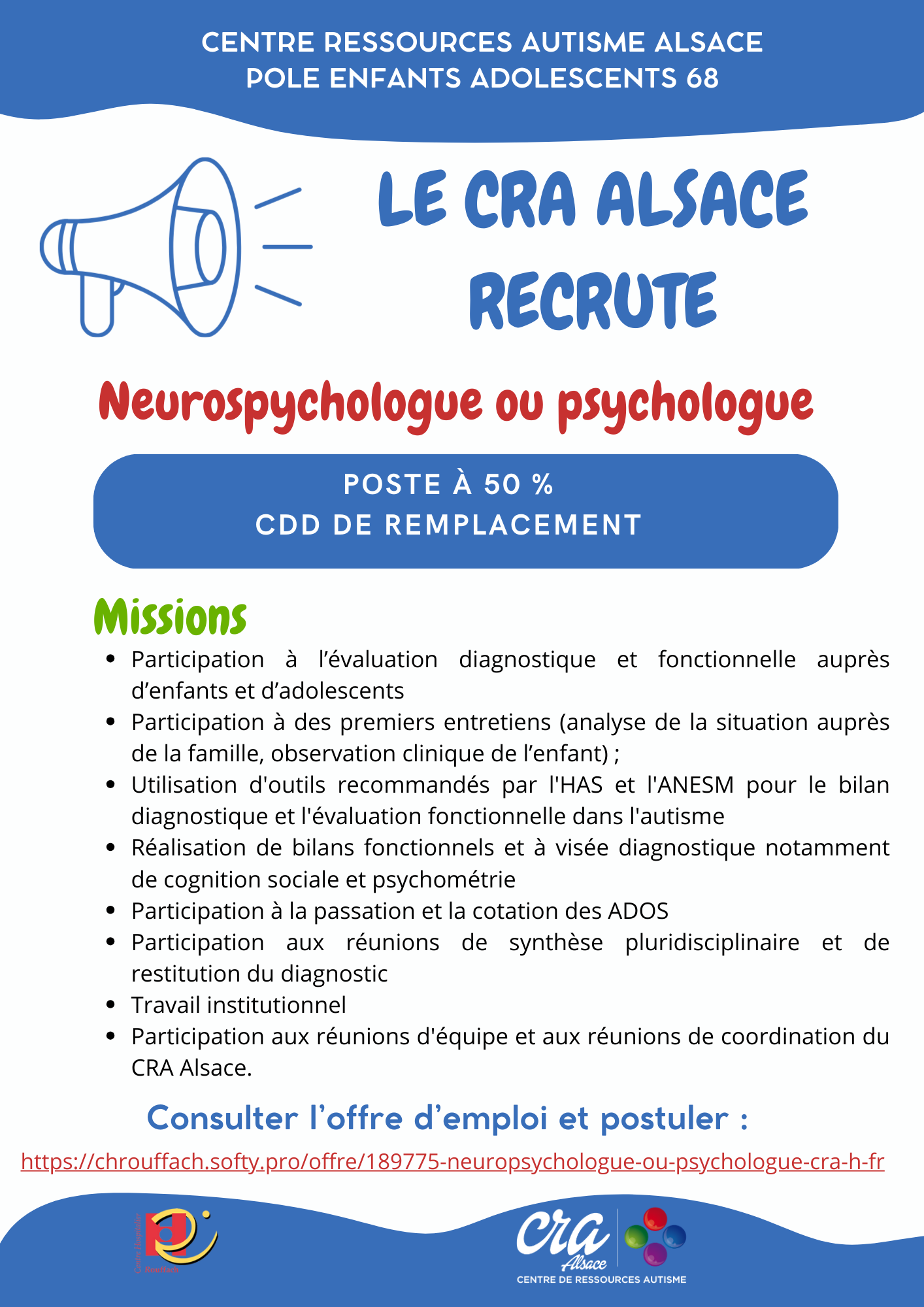 Le pôle enfants / adolescents 68 du CRA Alsace, situé au Centre Hospitalier de Rouffach recherche un-e neuropsychologue ou un-e psychologue.