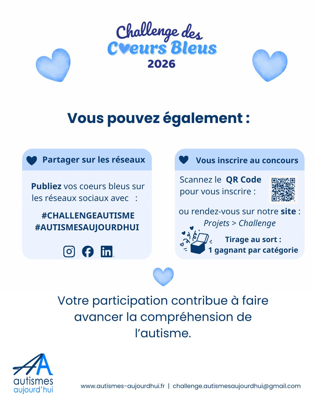 L’association Autismes aujourd’hui relance, à l’occasion de la Semaine de sensibilisation à l’autisme 2026, son challenge des coeurs bleus, afin de changer les regards sur l’autisme.