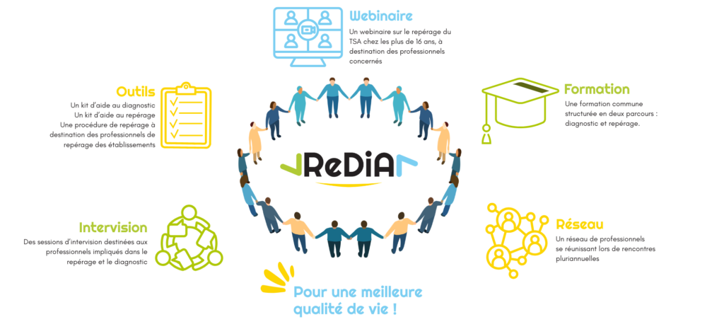 Le projet ReDiA, porté par le pôle Adultes 67, a pour objectif de renforcer les compétences des professionnels afin d’améliorer le repérage et le diagnostic des adultes avec TSA et de favoriser