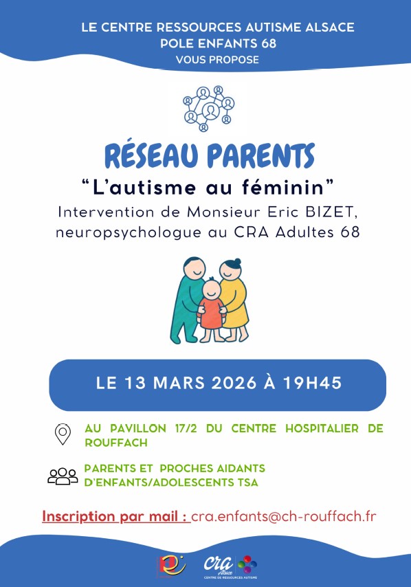 Le pôle enfants et adolescents 68 du CRA Alsace propose sa prochaine rencontre à destination des parents sur le thème “L’autisme au féminin” le vendredi 13 mars à 19h45 au Centre hospitalier de Rouffach.
