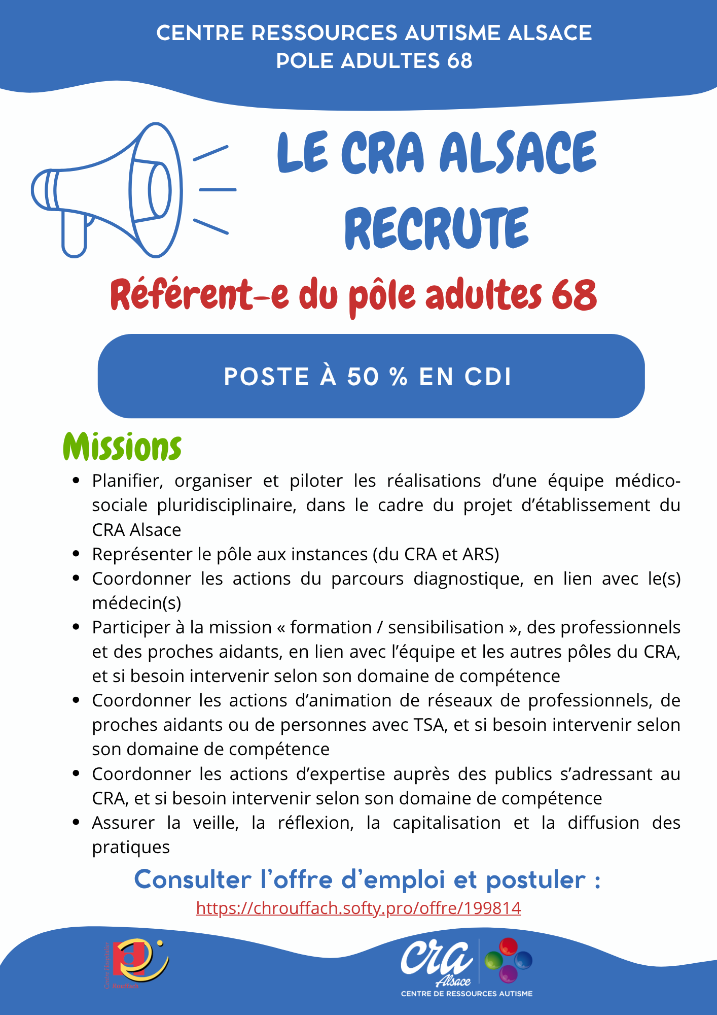 Le pôle adultes 68 du Centre Ressources Autisme Alsace, situé à l’Espace Autismes de Colmar. recrute un référent de pôle.
