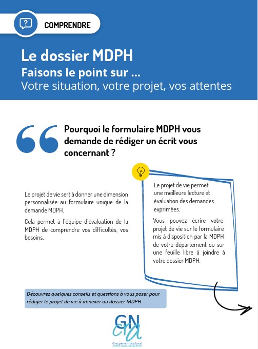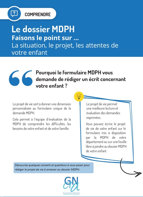 Elle fournit des conseils pour rédiger le projet de vie de leur enfant : description du profil de l’enfant et de ses particularités ; liste des différents domaines impactés par le handicap (scolarité, vie quotidienne, autonmie) et ses répercussions, afin de demander des aides (financières, accompagnement, orientation) adaptées à ses besoins.