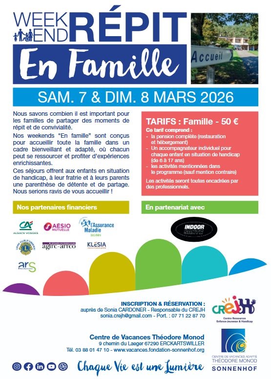 Le CREJH propose aux famille d’enfants en situation de handicap un week-end famille pour se ressourcer au Centre de vacances Théodore Monod à Erckartswiller les 7 et 8 mars 2026